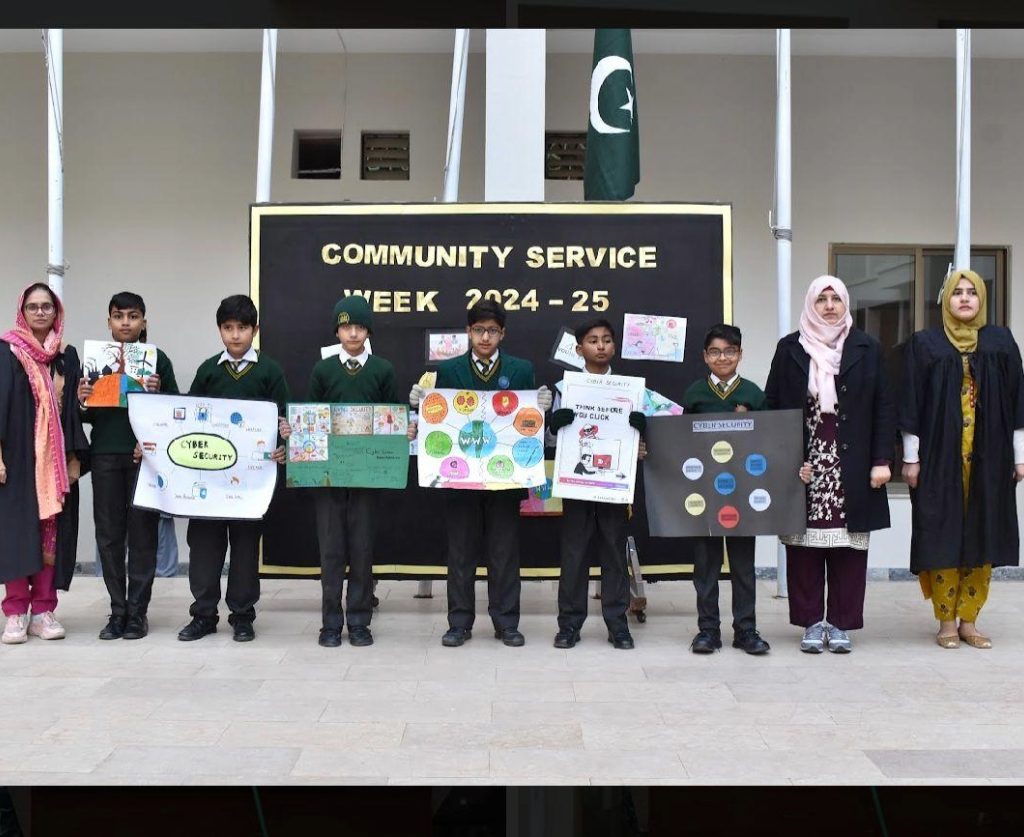 Snapshots from Community Services Week by Middle Wing Boys Campus showcasing a range of impactful activities: A unified start to the day with an inspiring Morning Assembly in which students recited few verses of Holy Quran and shared facts and slogans on different topics. They nurtured greenery in Community Gardens, shared heartwarming moments of appreciation through Tokens of Love for the domestic staff, and enlightening Awareness Campaigns on Cyber Security and Ethics, promoting a safer and more responsible community.